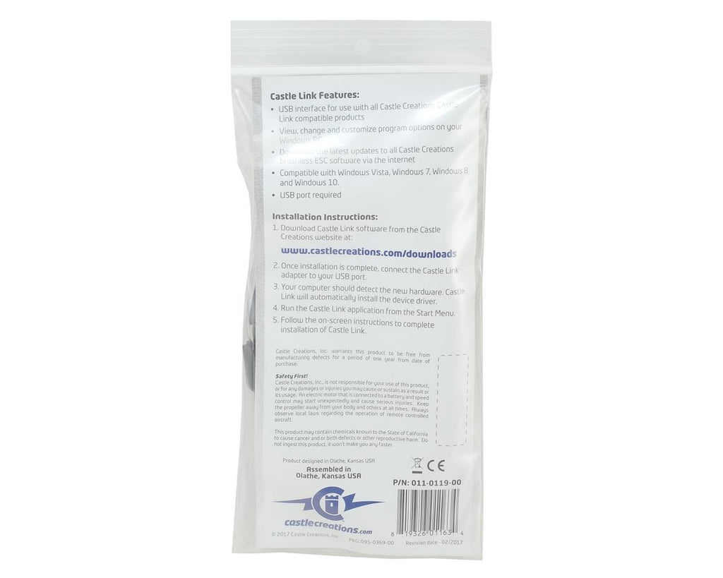 The Castle Creations Castle Link contains a proprietary interface adapter and standard USB cable that will give you in depth access to the programmable parameters of your Castle Creations ESC. All you need is an available USB port on your PC.