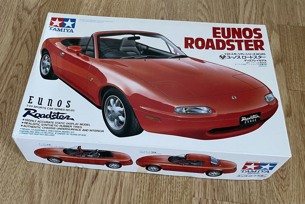 Tamiya 1/24 Mazda Eunos Roadster Model Kit. The Mazda Eunos Roadster, also known as the Mazda Miata or the MX-5, is a Japanese roadster sports car that was first introduced to the public in 1989. Its serial production began in the same year, and is still widely produced and loved today. The Mazda Motor Corporation engineered this car with victory in mind, crafting it in an attempt to win the roadster segment that was dominated by the aging Alfa Romeo Spider in the 1980s. Mazda had successfully created a compact, low-curb-weight vehicle that still maintained good performance, and offered a high level of safety as well as a balanced level of travel comfort. These qualities made the Mazda Eunos Roadster a cult title, and in 1995 and 2005 the model won the Car of the Year title.