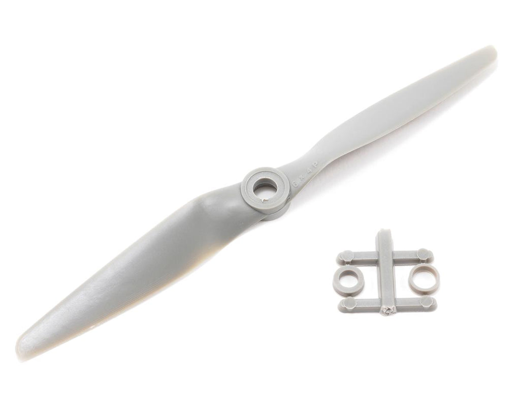 This is the APC 6x4 Speed 400 Pusher Propeller. APC propellers are manufactured using a pultrusion process which allows for a higher fiber (60%) to resin (nylon binder) density. This provides substantially higher strength and stiffness than glass-filled nylon. The additional stiffness is beneficial to control vibration resonance response. The higher strength allows the use of thinner cross-sections, beneficial to weight and aerodynamic efficiency.