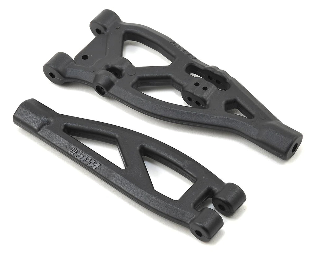 RPM A-arms for the ARRMA Kraton, Talion & Outcast as well as the Durango DEX8T are designed primary for strength and durability but RPM has added a few extra features in as well. First is slop elimination. These RPM A-arms reduce the amount of movement of the A-arm at the inner mounts, providing for better steering response and more consistent camber, caster and toe angle settings. The next improvement is the addition of a second shock mount hole further out on the arm, providing for a lower profile suspension set-up, allowing the shocks to lay down a little further, dropping the ride height for a lower center of gravity. As an added bonus, the front A-arms are roughly 10% lighter than stock (59.5g – RPM versus 66g stock)!