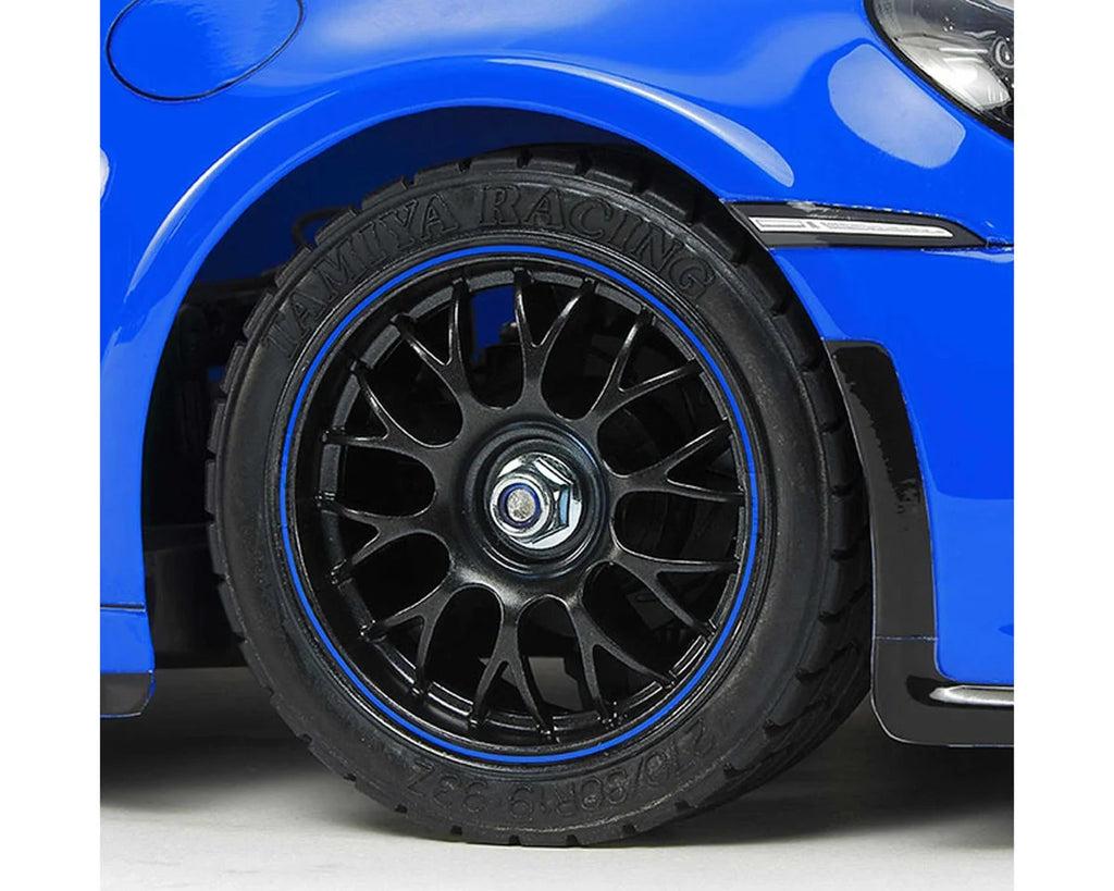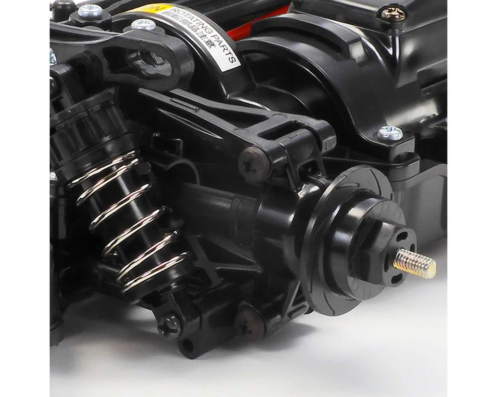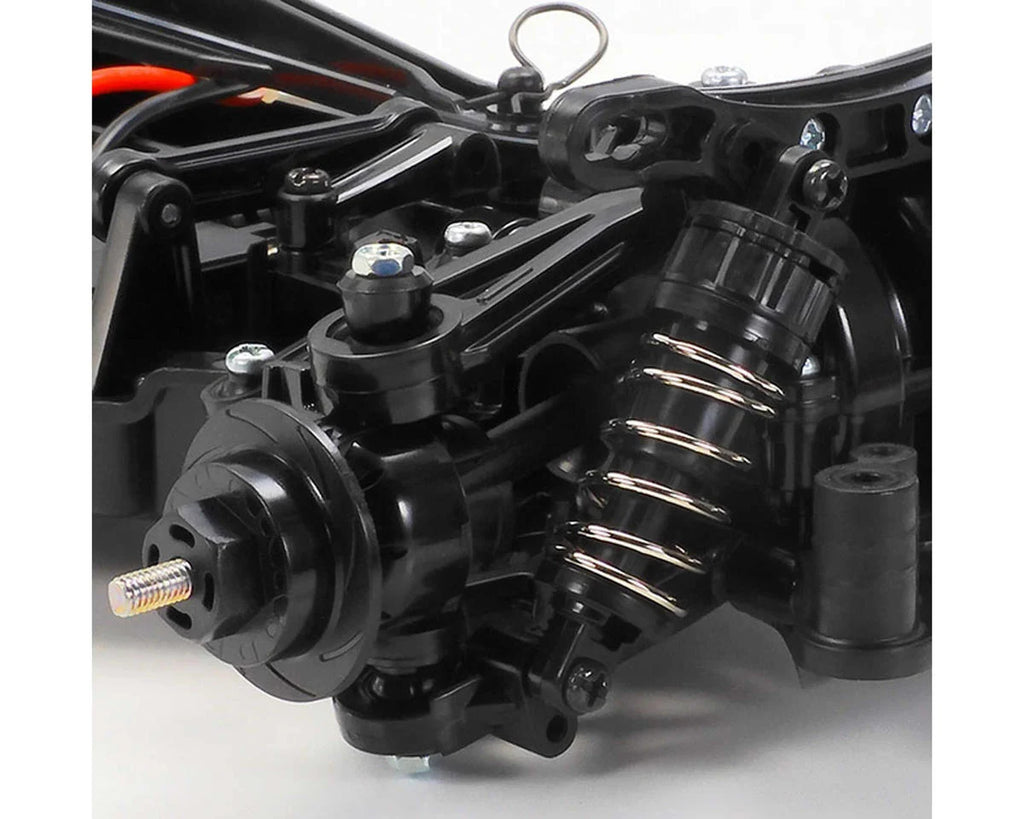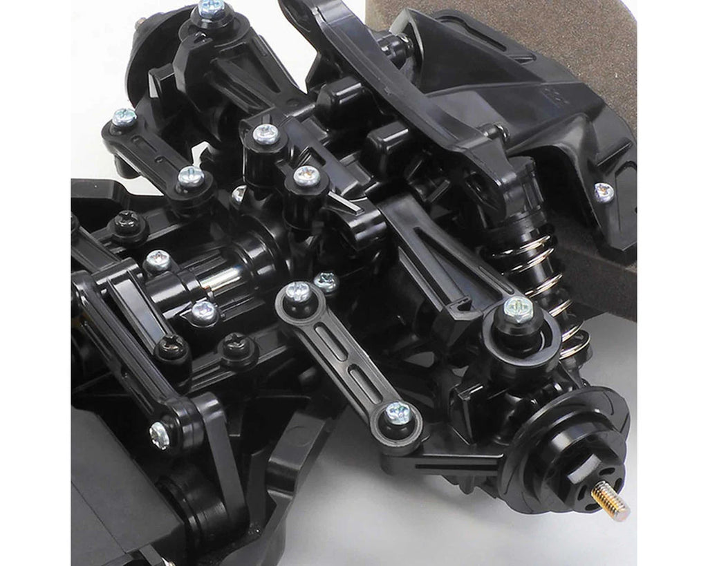 The TT-02 chassis, with its adaptable and balanced shaft-driven 4WD system, ensures excellent stability through a longitudinal layout featuring the battery on the left and the motor on the right. Its design incorporates identical left and right suspension arms and uprights for straightforward assembly, along with easily maintainable gearboxes. The chassis offers versatility with two wheelbases, two ground clearance settings, two tread setups, and a selection of ten gear ratios. Not only functional, it boasts aesthetic appeal with brake disc-shaped wheel hubs, stylish front bumper supports, gun metal color 10-spoke wheels, and sleek slick tires, delivering a sporty appearance.