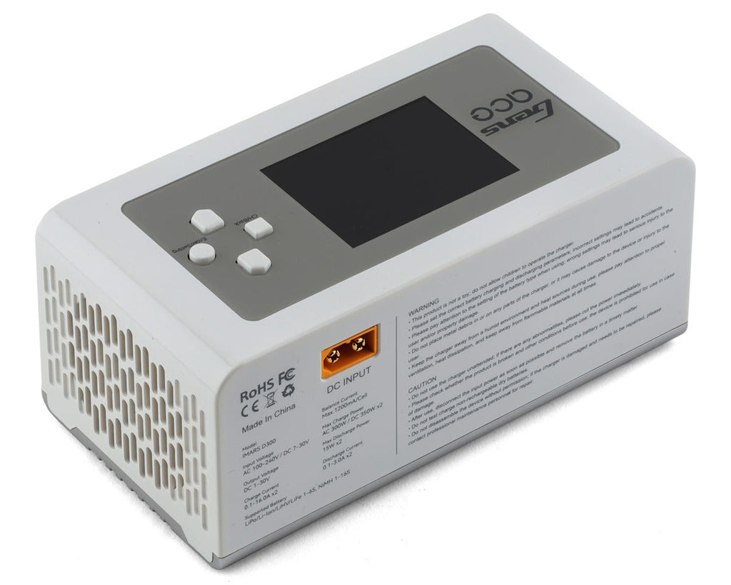 This is the Gens Ace Imars D300 G-Tech Smart Dual AC/DC Charger. Super versatile, powerful, compact and extremely user friendly, this Imars D300 charger is nothing less than amazing! Features a small and lightweight portable design with a wide IPS display, built-in DC power source for different devices, advanced safety features and the G-tech smart charging system all in one elegant black or white case for you to pick from. Get this Imars D300 G-Tech smart dual AC/DC charger and experience all the mighty power and versatility in a super compact frame.