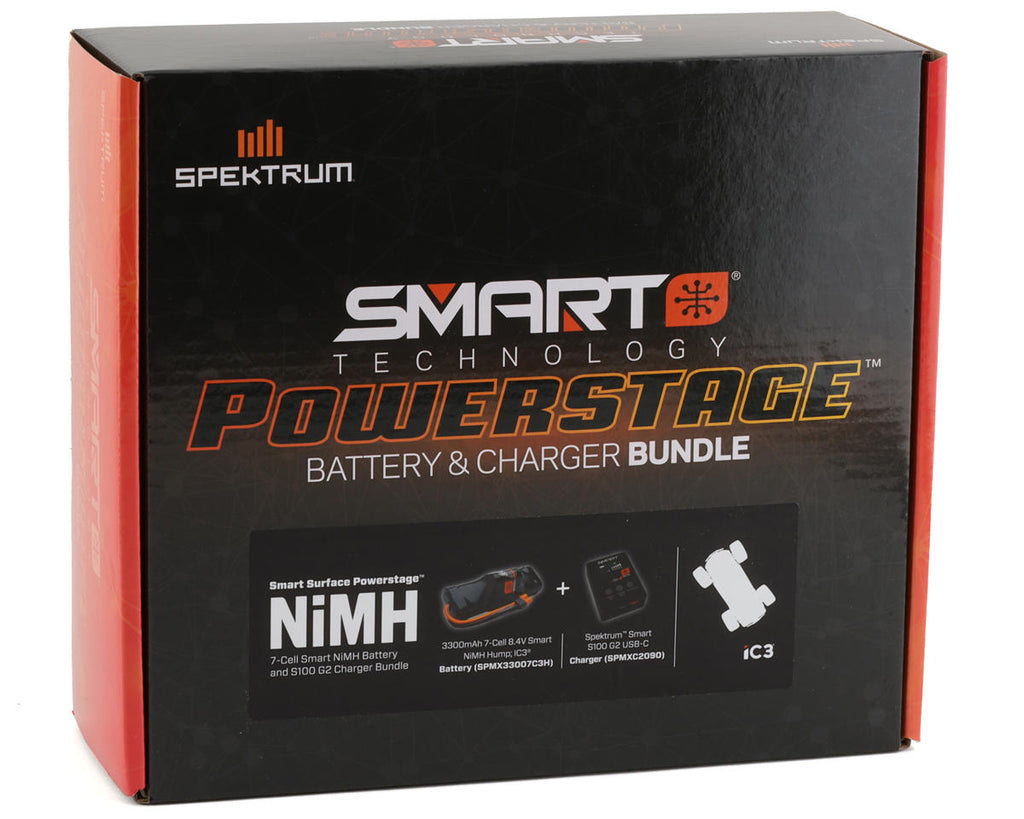 The Spektrum Smart PowerStage Bundle with Smart NiMh Battery is designed as a one-box solution for surface RC models requiring a 7-Cell NiMH battery equipped with an IC3 Connector. With the Smart Powerstage bundles, users get the most advanced and easiest-to-use battery and charging technology.
