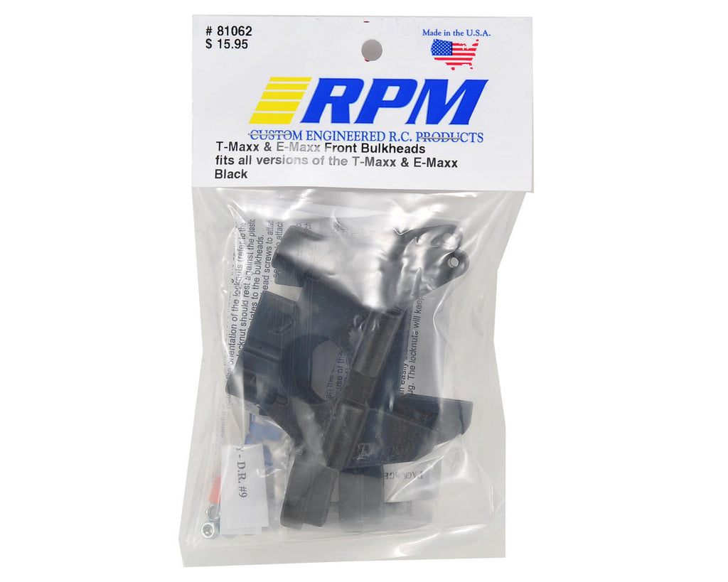 This is an optional RPM Traxxas Maxx Front Bulkhead Set. Until now, the Traxxas T-Maxx and E-Maxx line of trucks has been missing a key link in the chain of RPM durability – the bulkheads. Using some creative engineering, RPM has found a way to solve common bulkhead breakage issues. Starting with the RPM trademark blend of incredibly strong nylons, RPM redesigned key areas to improve impact resistance. But the most significant change comes in the form of lock nuts.