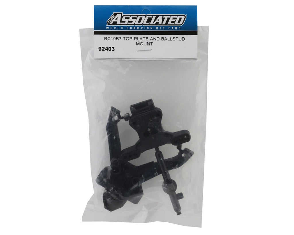 Team Associated RC10B7 Top Plate & Ballstud Mount Set. This replacement set is intended for the Team Associated RC10B7 1/10 buggy. The package includes one top plate and one ballstud mount.