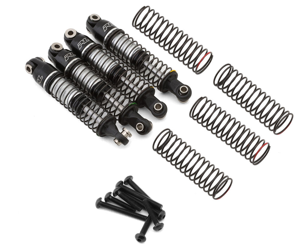 The Big Bore Shocks come pre-assembled in a set of 4 with all mounting hardware included. All you need to do is unscrew the top cap and add silicone shock oil to fill the shock body and experience the supreme damping action! Three spring rates are included with these shocks, Green (Soft) for the front, Yellow (Medium) for the rear, and optional Red springs (Hard) for heavier bodies or a tuning option. Get your own Pro-Line Big Bore Scaler shocks and elevate your TRX-4M performance and crawling abilities!