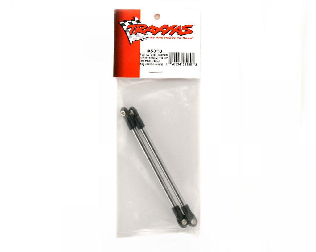 Pair of steel push rods come assembled with rod ends. For use with long-travel or 5357 progressive-1 rocker arms.