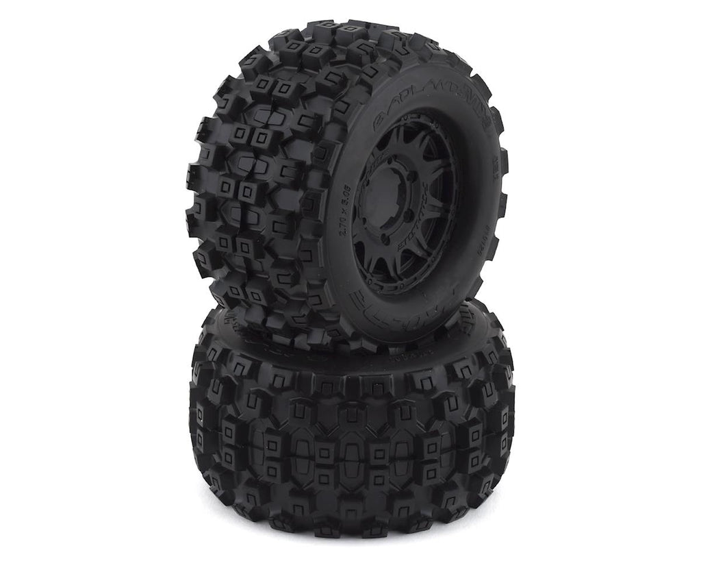 This is the Pro-Line Badlands MX28 2.8" Tires on Black Raid 6x30 Front or Rear Adjustable Offset Wheels (2) with 12mm Hex. The removable hex design makes these super versatile, and easy to repair should you damage a hex. These can be used with Traxxas 2WD & 4x4 Stampedes, Rustlers, and even the Slash if turning it into a monster Slash!