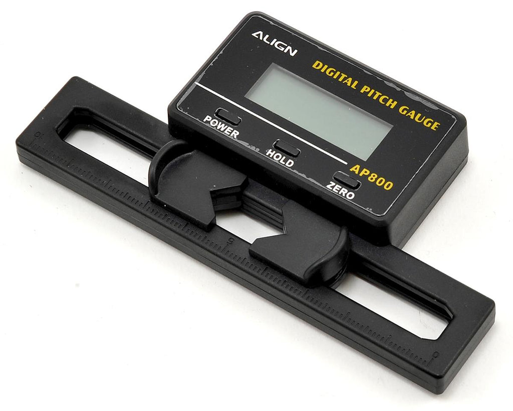 This is the Align AP800 Digital Pitch Gauge. Developed by Align's R&D team, the AP800 digital pitch gauge is suitable for flybar and flybarless helicopters and features an auto-detecting Horizontal level, and the results are displayed through a high contrast LCD screen, providing a simple and precise way to measure pitch angles.