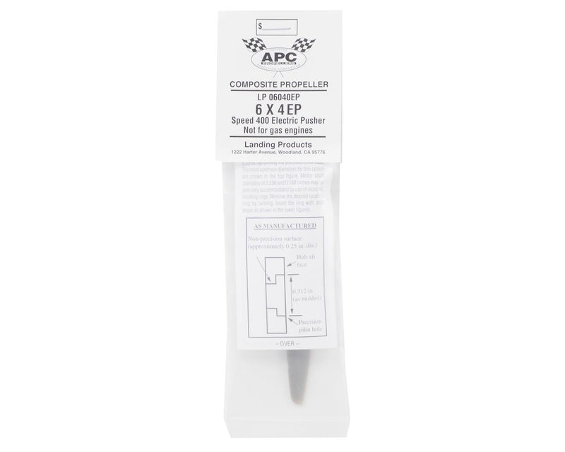 This is the APC 6x4 Speed 400 Pusher Propeller. APC propellers are manufactured using a pultrusion process which allows for a higher fiber (60%) to resin (nylon binder) density. This provides substantially higher strength and stiffness than glass-filled nylon. The additional stiffness is beneficial to control vibration resonance response. The higher strength allows the use of thinner cross-sections, beneficial to weight and aerodynamic efficiency.