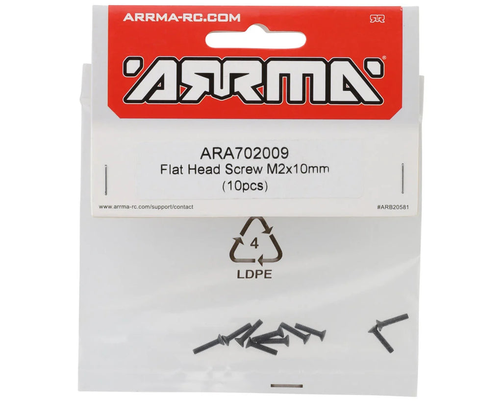 Screw Overview: Arrma 2x10mm Flat Head Screw. This is intended to replace stock kit components on your Arrma vehicle. Includes: (10) 2x10mm flat head screws These high-quality Flat Head Screws are the perfect items for servicing your ARRMA vehicle. Strong steel material for long-lasting durability and consistent fit Precision manufactured...
