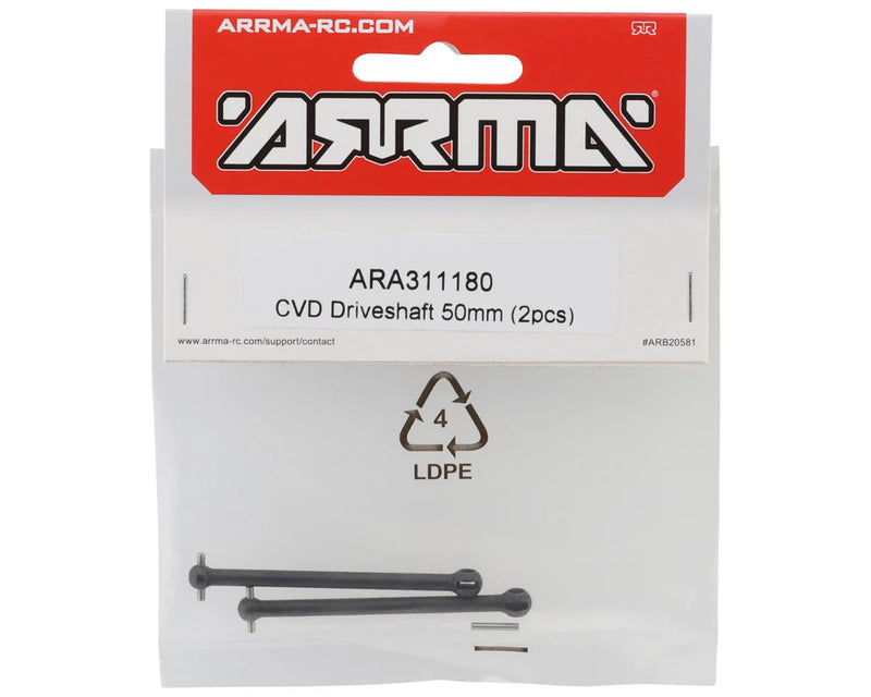 Dogbone Overview: This is the 50mm CVD Driveshaft from Arrma. These tough driveshafts are the perfect replacement, ensuring your RC vehicle runs smoothly and efficiently. Features: Durable construction Direct replacement part Reliable performance Includes: (2) 50mm CVD Driveshaft (2) Drive Pins