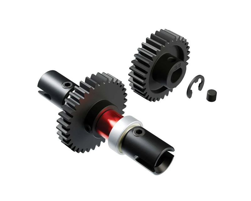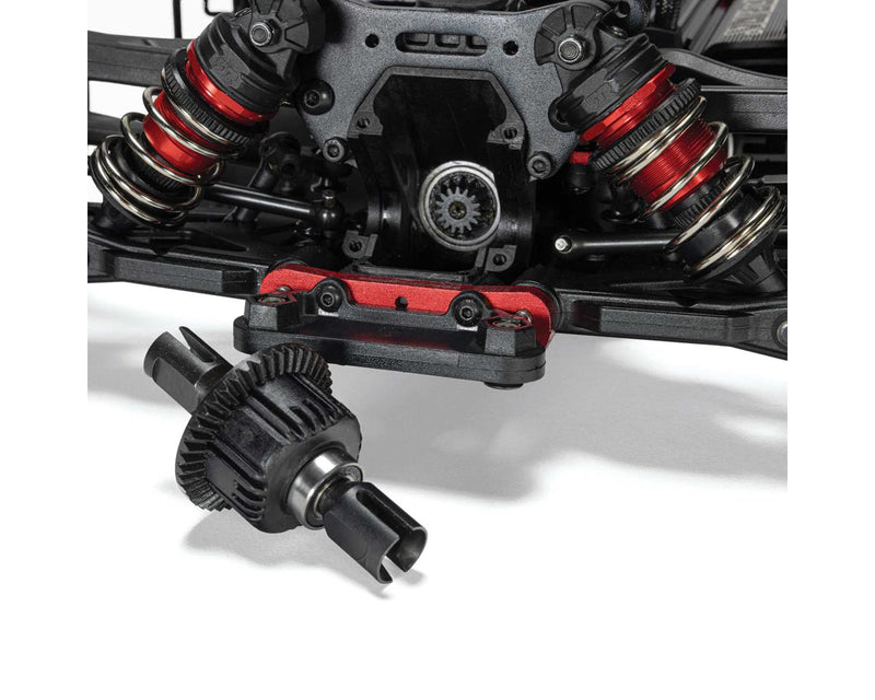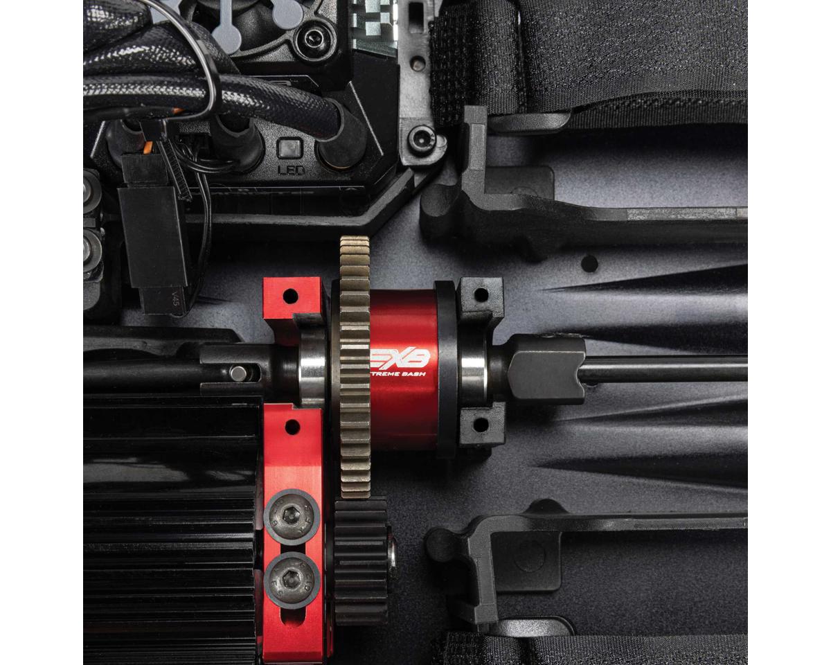 The 3mm anodized aluminum chassis is reinforced with a center brace for the durability needed to handle the stress of 120+ mph speeds. Optimized for 8S power, the 4X4 transmission features EXB differentials with all-metal differential outdrives and gearbox internals. The 34T Mod 1.0 spool combines with a bearing-supporting rear center driveshaft to reduce drivetrain vibration. Stiff front springs and sway bar improve high-speed handling, and a wide rear track increases stability.