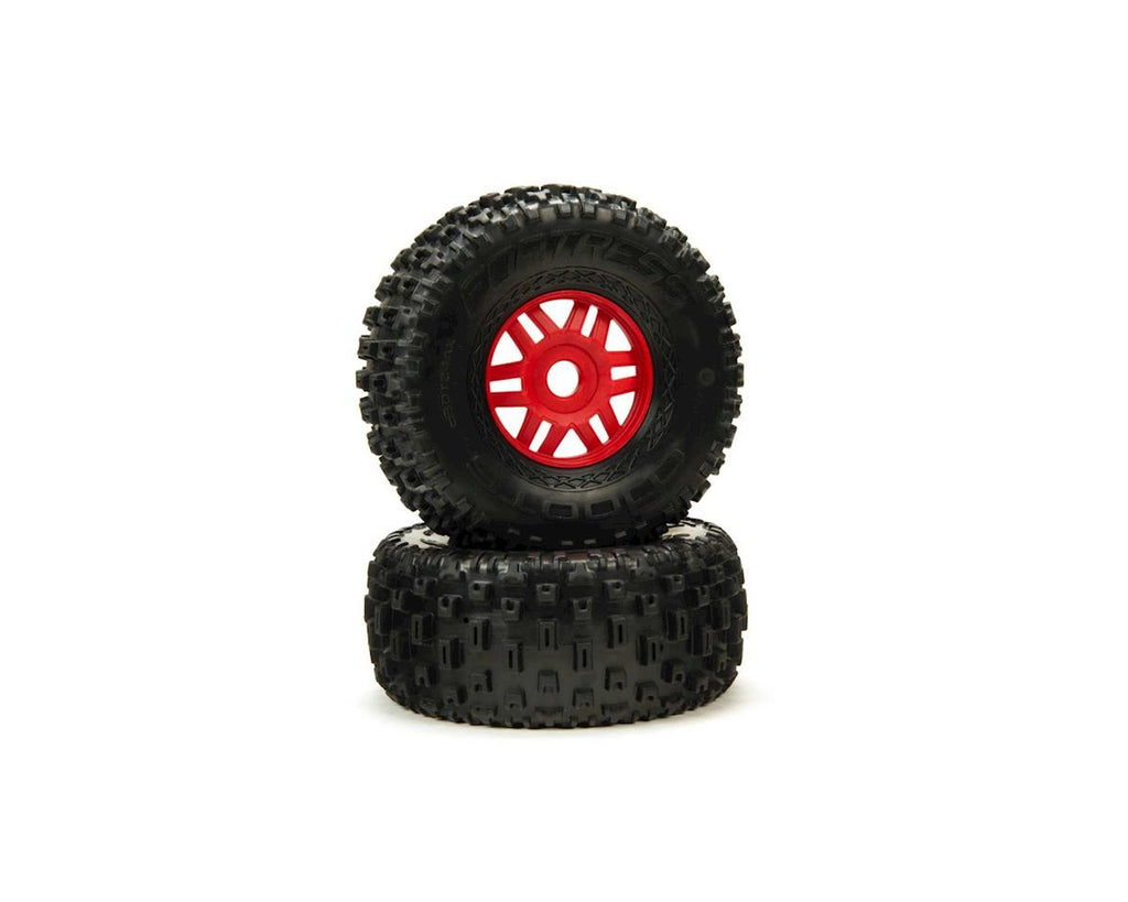This is a Arrma dBoots 'Fortress' Pre-Mounted Tire Set, intended for use with the Mojave BLX kits and pre-mounted on red split-spoke Arrma wheels and are ideal replacements for your kit items.