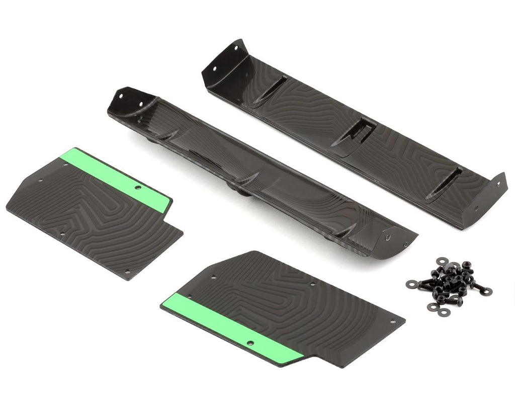 - Includes high and low downforce wings, wing endplates and wing attachment fasteners