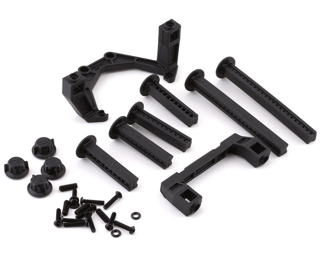 Pro-Line Extended Front and Rear Body Mount Kit with Secure-Loc Caps, for the Traxxas Rustler 4x4. This mount kit includes adjustable body mounts so you can fit different bodies onto your truck while still working with the stock body.