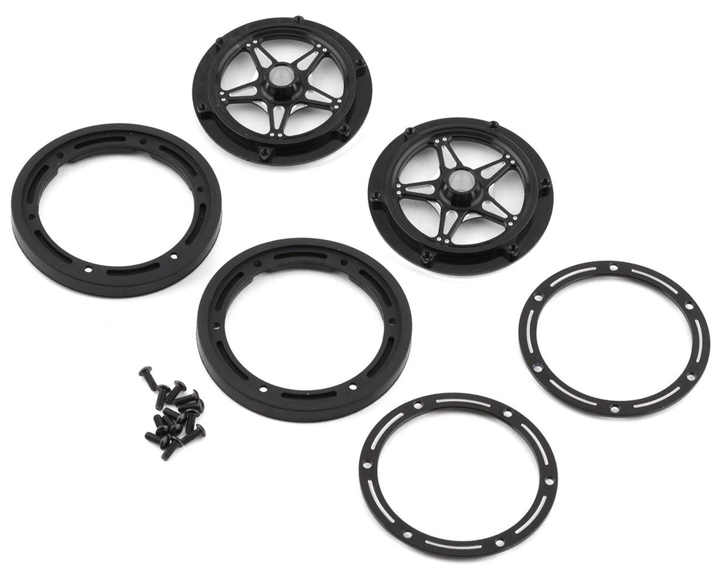 DragRace Concepts Ultra Lock Front Wheels are the first captured tire designs for 1/10th scale drag racing. DRC started with a custom designed 2.00" diameter front tire that inserts into the base of the wheel. The outer bead lock style ring has matching inserts that fit into the front tire to create a captured front tire that will withstand the quickest 1/10th scale drag set ups. The 5-spoke wheel design is CNC machined aluminum with bright anodizing and two tone relief milling to add a touch of flash.
