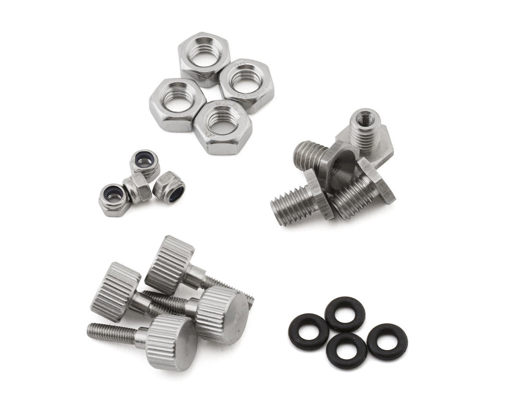 This Canopy Thumbscrew Set includes: (4) Thumb Screws, (4) Hull Inserts with Nuts, (4) O-Rings, and Hardware. Note: Must glue inserts into hull to prevent spinning while threading on the thumbscrews