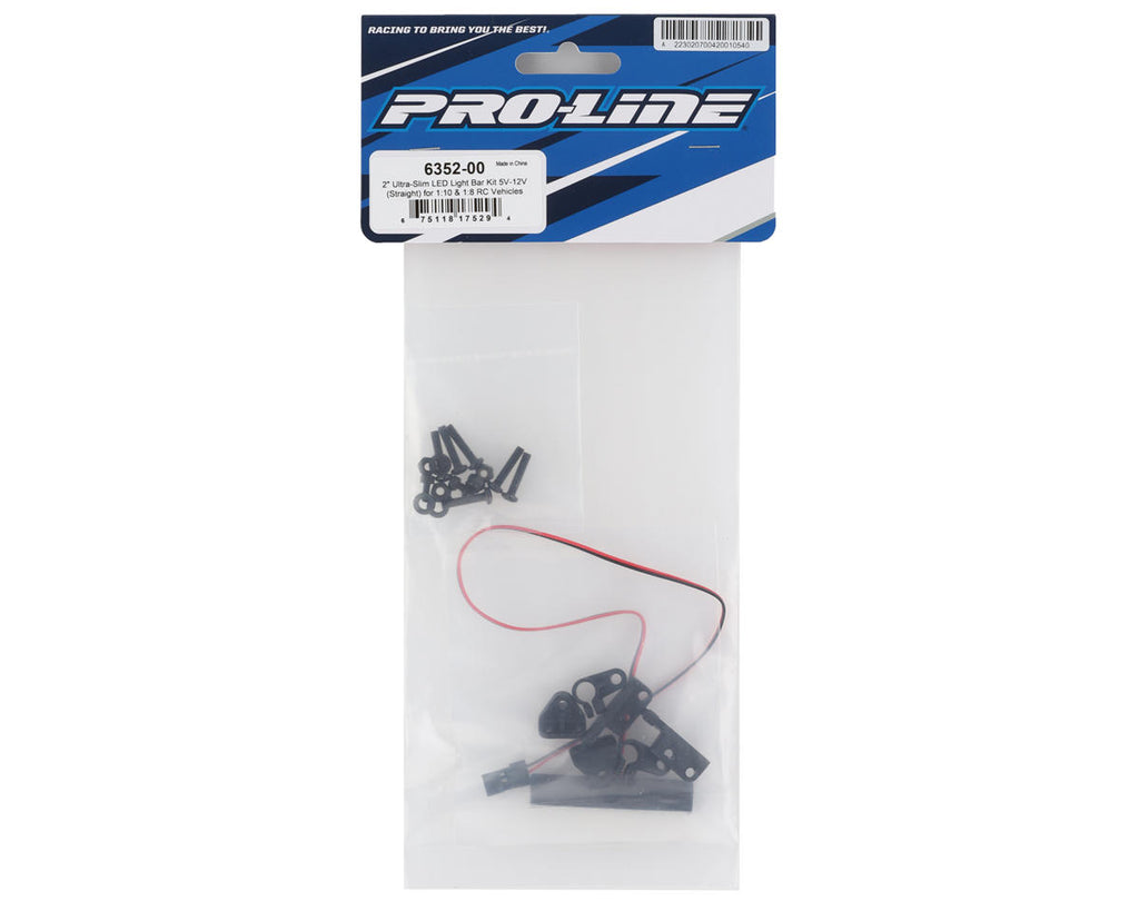 Pro-Line 2" Ultra-Slim Straight LED Light Bar Kit. This next generation light bar features a low-profile and highly detailed injection-molded housing and was designed to deliver exceptional brightness and style to your RC vehicle. Featuring a super-bright strip of LEDs that runs off 5-12V power, these light bars come ready to use with "plug & play" industry-standard receiver plugs and a 12" lead that can be plugged directly into your receiver or wired directly to a 2S or 3S battery.