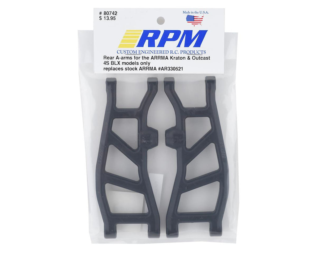 This is an optional set of RPM 4S Kraton and Outcast Rear Suspension Arms, intended for use with ARRMA Kraton and Outcast kits and designed for strength and durability with features to better enhance performance. These A-arms deliver excellent slop elimination by reducing the amount of movement of the A-arm at the hinge pins, providing for better steering response and more consistent camber, caster and toe angle settings. The addition of a second shock mount hole further out on the arm provides a lower profile suspension set-up. This shock position allows the suspension to lay down a little further, dropping the ride height for a lower center of gravity and better cornering stability. All RPM A-arms are molded from their nearly indestructible blend of engineering grade nylons for performance you can rely on when conditions are at their worst. These arms are almost 25% thicker and able to take much more damage than stock.