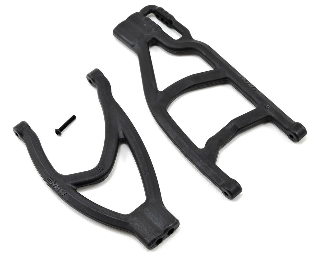 RPM Traxxas Revo/Summit Extended Rear Right BLACK A-Arms. RPM extended rear A-arms are designed around the already solid and proven RPM Revo rear A-arm design. Each set of RPM extended rear A-arms incorporates all stock geometry including options for either a 10mm or 19mm extension. All RPM molded products are backed by RPM's limited lifetime warranty against breakage. For unmatched performance, reliability you can trust and unmatched durability, you can’t go wrong with a set of RPM A-arms installed on your ride!