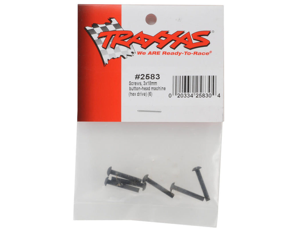 This is a pack of six Traxxas 3x18mm Button-Head Machine Screws, and are intended for use with the Traxxas Slash, Jato 3.3, Rustler VXL, E-Maxx 16.8V and E-Maxx Brushless vehicles.
